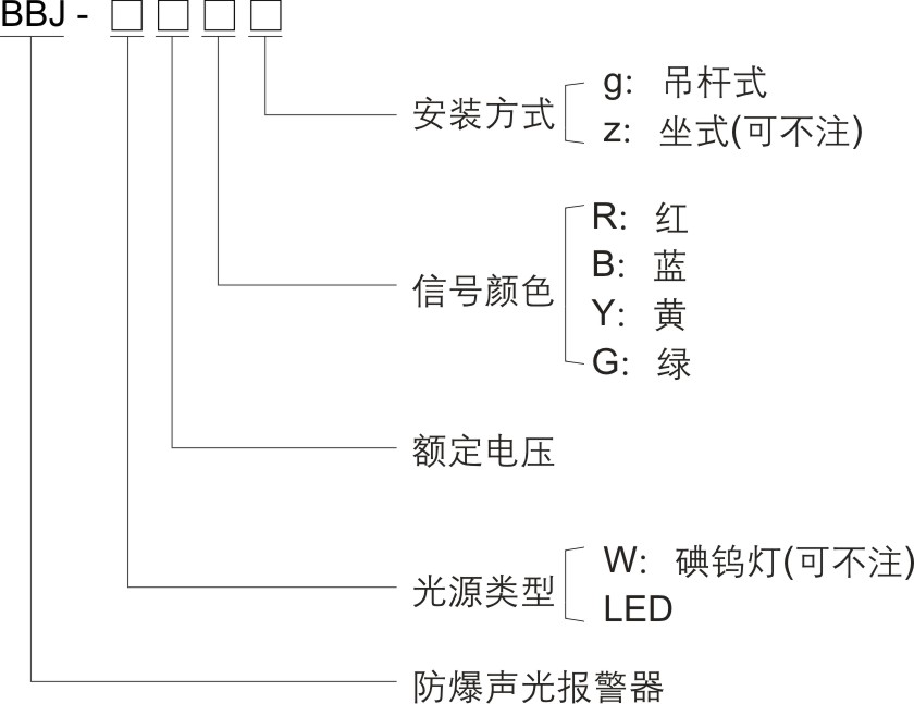> 按照產品型號規格說明逐條選擇并注明防爆標志,例如:需要ⅡB,信號顏色為紅色,吊桿式安裝的防爆聲光