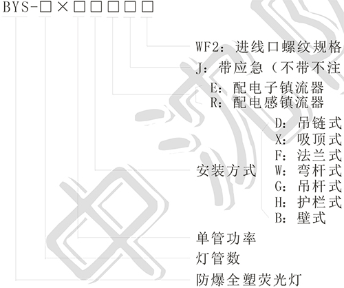 安裝方式:吊鏈式(D)、吸頂式、(X)、法蘭式(F)、彎桿式(W)、吊桿式(G )、護欄式(H)、壁式(B )