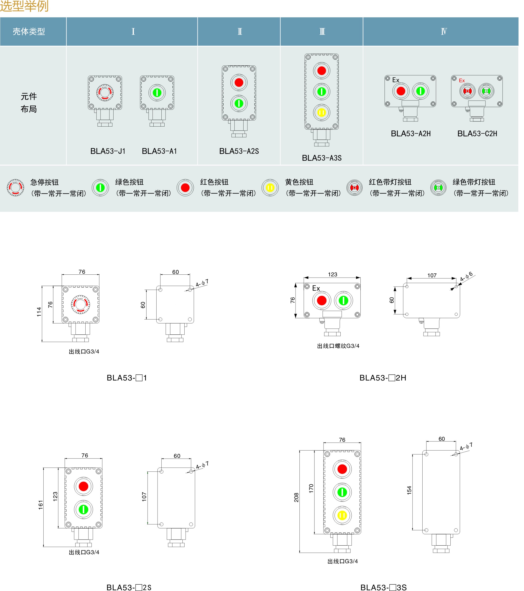 | BLA53-J1 | 1常開、1常閉 | Ⅰ | 帶1個急停按鈕 |
