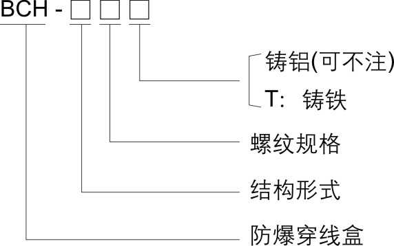> 按照產品型號逐條選擇并注明防爆標志及結構形式、螺紋規格等參數,例如:需要增安型鑄鋼 G1″A 型穿線盒,則產品型號為 BCH-AG1″T ExeⅡC Gb/Ex tD A21。