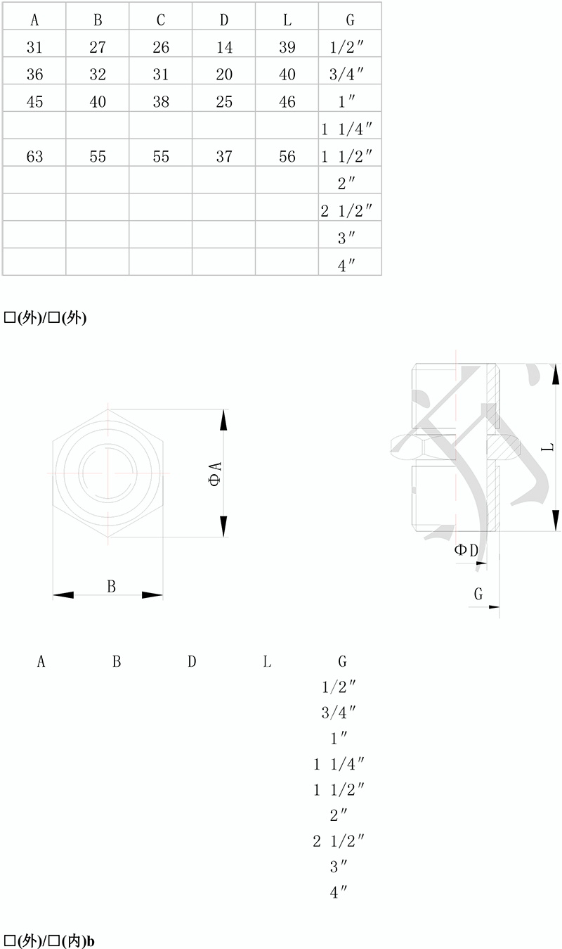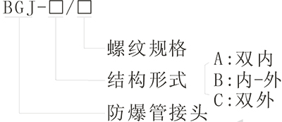 > 按照產(chǎn)品型號逐條選擇并注明防爆標志,例如:需要一內(nèi)一外 G3/4″螺紋防爆管接頭,則產(chǎn)品型號為 BGJ-G3/4″(外)/G3/4″(內(nèi)) ExdⅡC Gb;需要內(nèi) G3/4″外 G1 1/4″螺紋防爆管接頭,則產(chǎn)品型號為 BGJ-G3/4″(外)/ G1 1/4″(內(nèi))b ExdⅡC Gb。